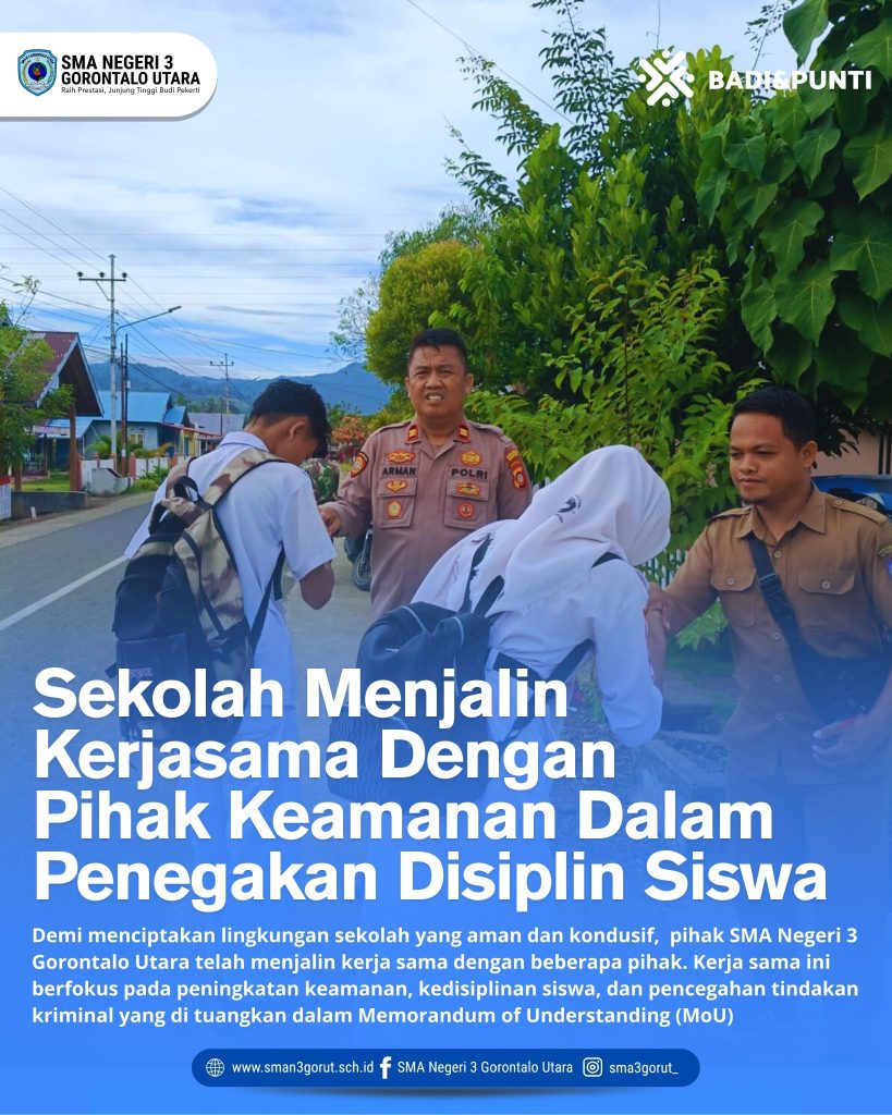 Demi menciptakan lingkungan sekolah yang aman dan kondusif, SMA Negeri 3 Gorontalo Utara menjalin kerja sama dengan pihak keamanan, yaitu Polsek Atinggola dan Koramil Atinggola. Kerja sama ini dituangkan dalam Memorandum of Understanding (MoU) yang berfokus pada peningkatan keamanan, kedisiplinan, serta pencegahan tindakan kriminal di lingkungan sekolah. Diskusi kerja sama ini dipimpin langsung oleh Kepala […]