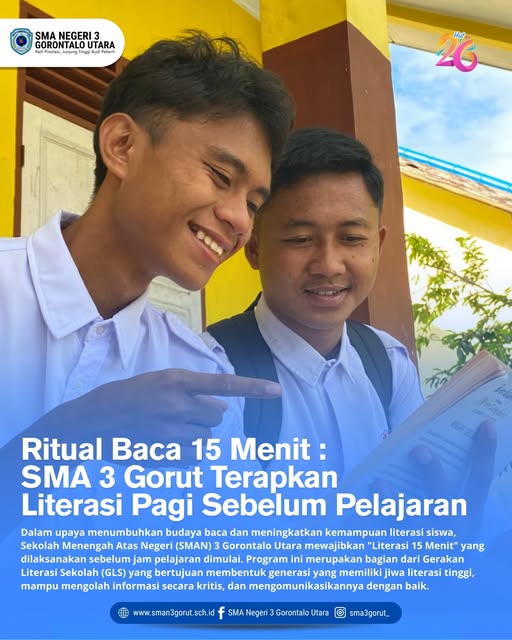 Dalam upaya menumbuhkan budaya baca dan meningkatkan kemampuan literasi siswa, SMA Negeri 3 Gorontalo Utara mewajibkan program “Literasi 15 Menit” yang dilaksanakan sebelum jam pelajaran dimulai. Program ini merupakan bagian dari Gerakan Literasi Sekolah (GLS) yang bertujuan membentuk generasi dengan jiwa literasi tinggi, mampu mengolah informasi secara kritis, serta mengomunikasikannya dengan baik. Program Literasi 15 […]